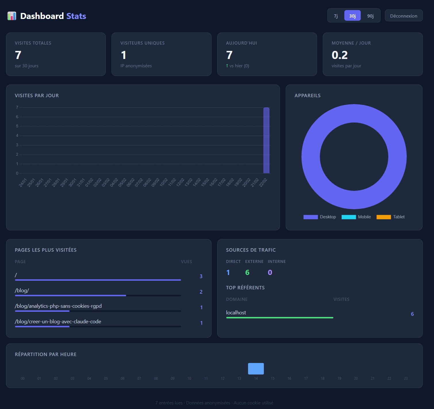 Zéro cookie. Zéro bandeau de consentement. Zéro dépendance externe en production. Zéro donnée personnelle identifiable stockée. Dashboard fonctionnel en moins de 200 lignes de PHP.